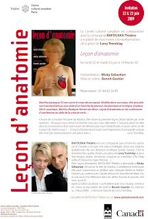 Et si, pour fêter l’été, on s’offrait une Leçon d’anatomie québécoise ? Mais attention, pas n’importe laquelle : une leçon d’anatomie théâtrale, signée par l’auteur dramatique, romancier et poète Larry Tremblay, mise en scène par notre collaborateur Benoit Gautier et interprétée par la comédienne Micky Sebastian, le tout sous la houlette forcément magistrale de la compagnie BAFDUSKA Théâtre ! Les 22 et 23 juin prochains, sur la scène du Centre culturel canadien, on pourra en effet découvrir Martha, une femme de presque 50 ans qui se penche sur son passé. Mutilée dans son coeur, elle ausculte son histoire d’amour aux côtés d’un homme de pouvoir et dissèque l’envers du décor…Larry Tremblay lui-même présente ainsi ce monologue puissant et douloureux : "Avant de connaître l’histoire de Martha, d’en écrire la première ligne, j’étais habité par cette question : pourquoi nous arrive-t-il d’aimer ceux qui nous détruisent ? Jusqu’où peut-on aller dans la connaissance d’un autre avant de détruire, par souci d’exactitude, ce qu’on aime, se détruisant du même coup ?… Si Leçon d’anatomie est avant tout l’expression d’une parole unique, elle n’est pas nécessairement une pièce solo.” Marie-Pauline Mollaret Blog d'Écran noir. 5 juin 2009 Leçon d’anatomie de Larry Tremblay 22 et 23 juin à 19 heures 30
